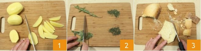 Pour réaliser les pommes de terre sablées, épluchez les pommes de terre et coupez-les en quartiers 1, puis placez-les dans un bol avec de l'eau froide pour éviter qu'elles ne noircissent. Pendant ce temps, hachez finement le romarin et la sauge 2 et réservez le hachis. Prenez maintenant la miche de pain, enlevez la croûte avec un couteau 3,