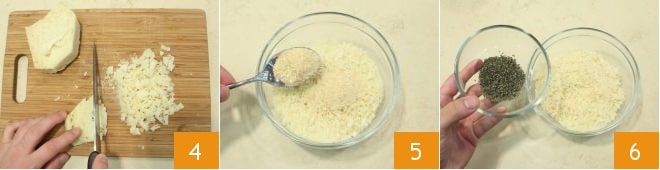coupez grossièrement la mie 4 et placez-la dans un petit bol, ajoutez la chapelure 5, le hachis d'herbes aromatiques 6