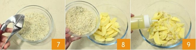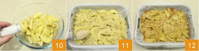 du sel 10 et du poivre selon votre goût. Mélangez les quartiers de pommes de terre et versez-les dans un plat recouvert de papier sulfurisé préalablement humidifié puis bien essoré afin qu'il adhère mieux au plat, enfin recouvrez les pommes de terre avec une cuillère de chapelure 11. Faites cuire les pommes de terre sablées dans un four statique à 180°C pendant 40 minutes (160°C dans un four ventilé pendant 30 minutes), puis passez-les au gril pendant 5 minutes. À la fin de la cuisson, vos pommes de terre sablées seront dorées et croustillantes 12, sortez-les du four et laissez-les tiédir avant de les servir.