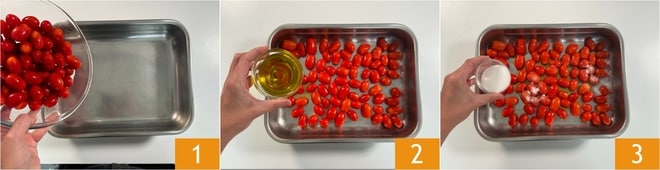 Pour préparer les tomates cerises confites, commencez par laver soigneusement les tomates. Disposez-les dans un plat 1 et assaisonnez avec de l'huile d'olive 2 et du sucre 3.