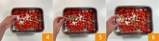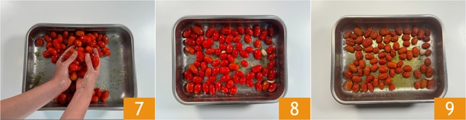 Massez les tomates cerises avec les mains 7 pour bien les assaisonner 8. Faites cuire dans un four préchauffé à 120°C en mode statique pendant 3 heures. Une fois prêtes 9, les tomates confites peuvent être dégustées chaudes ou laissées refroidir et conservées au réfrigérateur.
