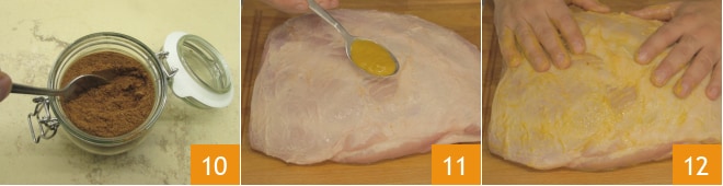 Mélangez bien toutes les épices pour obtenir un mélange homogène 10 ; si nécessaire, vous pouvez aussi le passer au tamis. Prenez maintenant l'épaule de porc, ajoutez la moutarde 11 et étalez-la avec vos mains sur toute la surface, supérieure et inférieure, pour créer une fine pellicule 12.