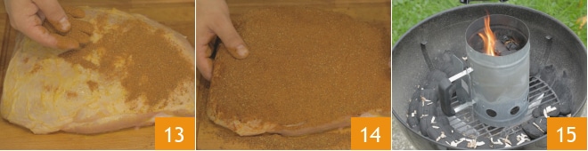 Ensuite, saupoudrez la viande de rub 13, en veillant à la recouvrir entièrement 14. Pendant ce temps, allumez le barbecue et réglez-le pour une cuisson indirecte 15.