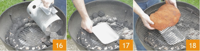 Versez le charbon de bois dans une moitié du barbecue 16 et placez de l'autre côté un plateau en aluminium pour recueillir les jus de viande 17, puis placez l'épaule de porc sur la grille dans la zone sans chaleur directe 18.