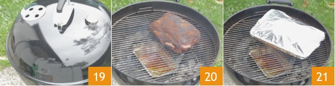 Réglez les ouvertures d'air pour obtenir une température d'environ 150° dans la chambre et procédez au fumage 19. Cuisez avec le couvercle pendant au moins deux heures ou jusqu'à ce que le rub ait formé une croûte, le fameux bark 20. À ce stade, transférez la viande dans un plateau en aluminium et enveloppez le tout dans de l'aluminium. Placez le plateau sur le barbecue 21 et poursuivez la cuisson pendant 6 à 8 heures supplémentaires, en veillant à ce que la température de la chambre reste autour de 130°-150°. Vous pouvez vérifier que la viande est cuite en mesurant la température au cœur, qui doit atteindre 97°-98°.