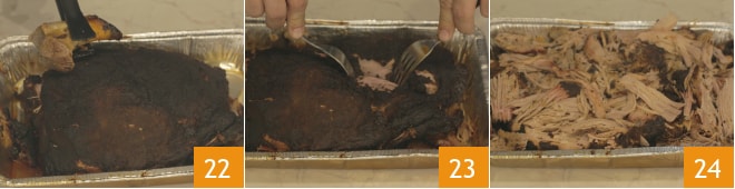 Une fois le temps de cuisson écoulé, égouttez le liquide de cuisson qui se sera formé dans le plateau et retirez les os avec une pince de cuisine 22, puis effilochez la viande simplement avec 2 fourchettes 23, en laissant aussi quelques morceaux entiers 24.