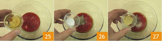 Préparez la sauce : versez le ketchup dans un bol avec le vinaigre de cidre 25, le poivre, le sel 26 et le gingembre en poudre 27.