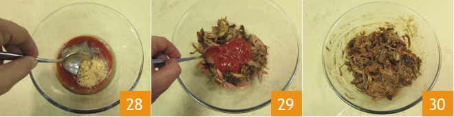 Mélangez bien 28 et ajoutez la sauce obtenue à la viande effilochée 29. Mélangez pour bien répartir l'assaisonnement 30.