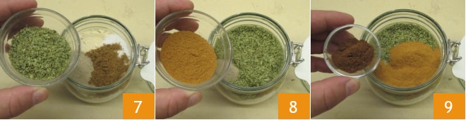 Enfin, ajoutez l'origan séché 7, le poivre de Cayenne 8 et l'anis en poudre 9.