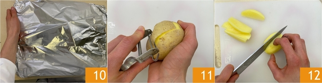 Couvrez également le plat avec une feuille d'aluminium 10 et enfournez pendant environ une heure à 180°C dans le four préchauffé en mode ventilé. Pendant ce temps, épluchez les pommes de terre 11 et coupez-les en quartiers 12.