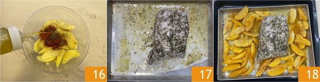 Ajoutez l'huile d'olive 16 et mélangez bien. Après une heure de cuisson de la viande, sortez le plat 17 et ajoutez les pommes de terre autour 18.