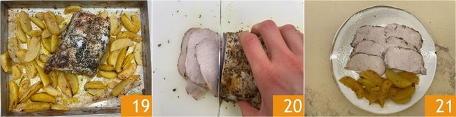 Poursuivez la cuisson pendant encore 30-40 minutes, sans couvrir le plat, jusqu'à ce que les pommes de terre soient dorées et croustillantes 19. Une fois cuit, laissez reposer le porc 10-15 minutes avant de le trancher 20. Servez le porc rôti avec les pommes de terre bien chaud !