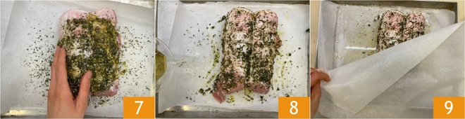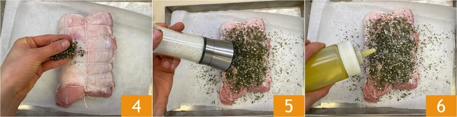 Transférez le rôti dans un plat avec du papier sulfurisé et parsemez la viande avec le hachis d'herbes 4, puis assaisonnez avec du sel 5, du poivre et de l'huile 6.