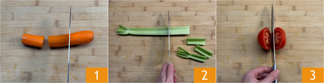 Pour préparer le bouillon de légumes, commencez par laver et parer les légumes. Coupez les carottes 1 et le céleri 2 en morceaux. Coupez les tomates en deux 3.