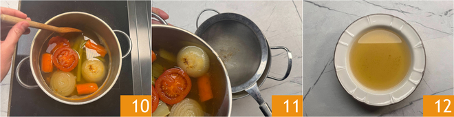 Portez à ébullition 10 et laissez mijoter sans couvercle, ou avec le couvercle entrouvert, pendant environ une heure. Goûtez et, si nécessaire, rectifiez l'assaisonnement en sel. Une fois le temps de cuisson écoulé, filtrez le bouillon à travers une passoire 11. Le bouillon de légumes est prêt à être utilisé pour vos recettes 12!