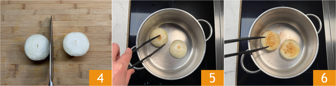 Faites de même avec l'oignon 4 et placez-le dans la casserole avec la partie coupée vers le bas 5. Allumez le feu et grillez l'oignon pendant environ 1 minute et demie, en veillant à ne pas le brûler. Puis retournez-le de l'autre côté et grillez encore pendant une minute 6.