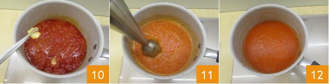 Après le temps écoulé, retirez le basilic et l'ail 10, puis à l'aide d'un mixeur plongeant, mixez les tomates pour obtenir une purée lisse 11. Laissez cuire encore pendant 25-30 minutes afin de la faire sécher et réduire un peu 12; puis éteignez le feu et laissez-la tiédir à température ambiante.