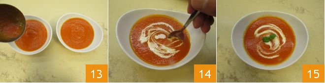 À ce stade, votre soupe de tomates sera prête, nous avons choisi de la servir dans des petits bols 13 et de la garnir avec de la crème fraîche. Si vous voulez le faire aussi, c'est vraiment très simple, il suffira de verser un peu de crème sur la soupe et avec une cuillère, former une spirale 14. Enfin, ajoutez une touche de couleur et de parfum à votre soupe de tomates en ajoutant une feuille de basilic et servez 15.