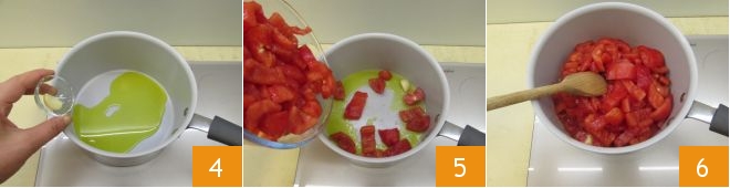 Dans une casserole, chauffez l'huile d'olive extra vierge avec une gousse d'ail pelée 4, après une minute, ajoutez les tomates 5 et mélangez en laissant s'imprégner pendant quelques minutes 6.