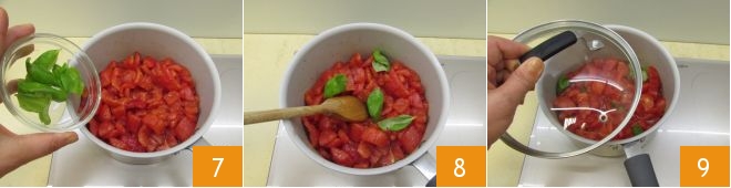 Ajoutez ensuite les feuilles de basilic 7, salez et donnez un dernier coup de cuillère 8 avant de couvrir avec un couvercle et de laisser cuire, à feu doux, pendant au moins 35 minutes 9.