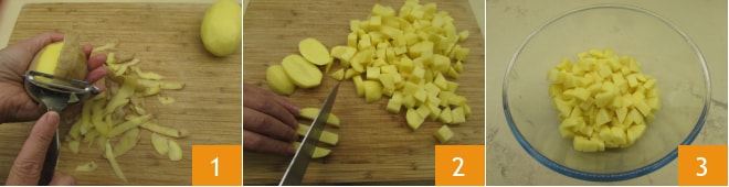 Pour préparer le potiron et les pommes de terre au four, commencez par éplucher les pommes de terre 1. Une fois épluchées, elles pèseront environ 550 g. Rincez-les pour éliminer les éventuels résidus de terre. Coupez ensuite les pommes de terre d'abord en tranches, puis en cubes d'environ 2 cm 2. Transférez-les dans un bol 3 et réservez.