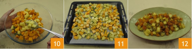 Mélangez bien 10, puis transférez sur une plaque recouverte de papier sulfurisé 11. Étalez bien le potiron et les pommes de terre pour qu'ils ne se superposent pas. Faites cuire dans un four statique préchauffé à 200° pendant 40 minutes et durant les 5 dernières minutes de cuisson, activez le gril pour les rendre plus dorés. Ensuite, sortez-les du four et servez 12.
