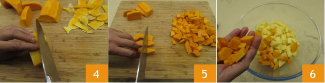 À ce stade, occupez-vous du potiron, commencez par l'éplucher et éliminer les éventuels filaments internes 4, vous en obtiendrez environ 450 g. Coupez-le d'abord en tranches, puis en cubes d'environ 3 cm 5 et transférez-les également dans le bol 6.