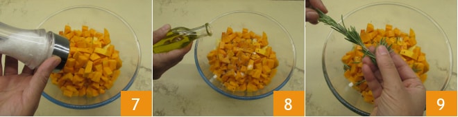 Assaisonnez avec du sel 7, du poivre, de l'huile 8 et les aiguilles de romarin 9.