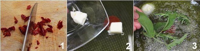 Pour préparer le poulet à la diable à la bière avec pommes de terre et petits oignons, commencez par enlever les graines du piment et le couper en petits morceaux 1. Prenez maintenant une grande poêle, versez l'huile d'olive et le beurre 2 et dès que c'est bien chaud, ajoutez une branche de romarin, les feuilles de sauge 3 et laissez parfumer.