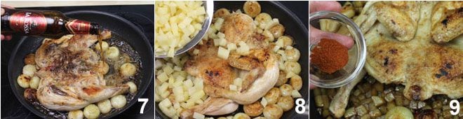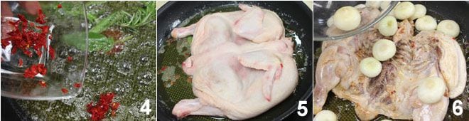 Ajoutez le piment haché 4 et à ce moment-là le poulet, que vous aurez ouvert en coupant la poitrine en deux. Posez-le du côté sans peau 5 et laissez-le dorer des deux côtés pendant quelques minutes ; puis ajoutez les petits oignons et laissez-les cuire avec le poulet pendant 10 minutes 6.