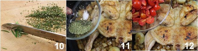 Hachez finement l'autre branche de romarin 10 et ajoutez-la dans la poêle avec le poulet 11. Enfin, dix minutes avant la fin de la cuisson, ajoutez les tomates cerises coupées en quartiers 12, rectifiez l'assaisonnement si nécessaire et servez votre poulet à la diable à la bière!