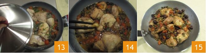 Couvrez avec le couvercle 13 et poursuivez la cuisson pendant 25 minutes à feu doux. Après ce temps, ajoutez le reste de fenouil et poursuivez la cuisson sans couvercle pendant 15-20 minutes à feu moyen, en remuant de temps en temps. À la fin de la cuisson, retirez les gousses d'ail en chemise et rectifiez l'assaisonnement si nécessaire 14. Servez votre poulet à la sicilienne bien chaud 15.