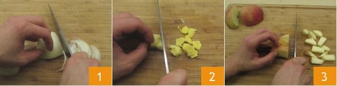 Pour réaliser le poulet au curry avec des pommes, commencez par préparer l'oignon et le trancher 1, épluchez également le gingembre frais et hachez-le 2. Lavez, puis coupez la pomme en morceaux irréguliers d'environ 2 cm en gardant la peau 3.
