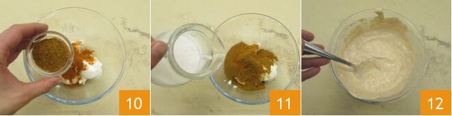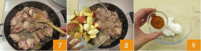 Tournez le poulet pour le faire dorer de tous les côtés, puis retirez l'ail 7. Ajoutez ensuite les morceaux de pomme 8 et mélangez le tout. Continuez la cuisson, et entre-temps dans un bol, mélangez le yaourt, le piment en poudre 9,