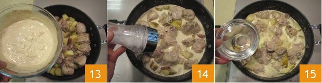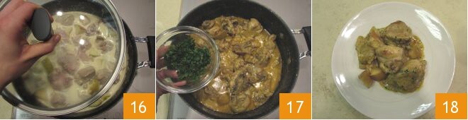 et faites cuire avec le couvercle 16 pendant au moins 20 minutes à feu moyen (en secouant de temps en temps la casserole pour éviter que le poulet ne colle au fond). Après les vingt minutes, retirez le couvercle et continuez la cuisson pendant encore 10/12 minutes. Passé ce temps, ajoutez le persil haché 17 et le poulet au curry avec des pommes sera prêt, servez-le bien chaud 18!