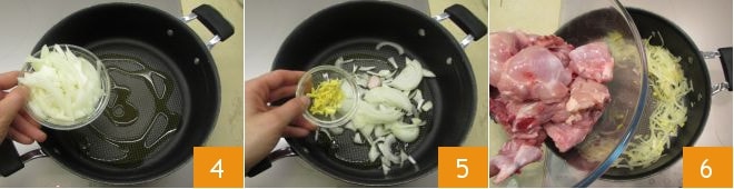 Versez un filet d'huile dans une casserole, ajoutez l'oignon 4, une gousse d'ail et le gingembre 5 et faites revenir à feu doux. Lorsque l'oignon est suffisamment fondu, augmentez la flamme et faites dorer les morceaux de poulet 6.