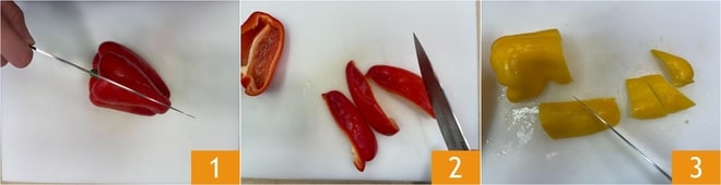 Pour préparer le poulet aux poivrons à la romaine, commencez par laver les poivrons. Divisez-les en deux 1 et éliminez les graines et les filaments internes. Coupez les poivrons en tranches 2 puis en morceaux 3.