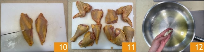 Divisez les blancs en deux s'ils devaient être trop grands 10. Une fois que vous aurez coupé le poulet en morceaux, salez-le bien 11 et passez à la cuisson. Dans une grande poêle, versez l'huile et 2 gousses d'ail 12