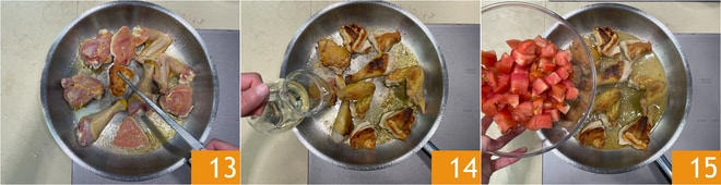 Ajoutez ensuite les morceaux de poulet et, lorsqu'ils seront bien dorés, retournez-les 13 et enlevez l'ail. Laissez dorer également de l'autre côté et déglacez avec le vin blanc 14. Une fois évaporé complètement, ajoutez les tomates 15.