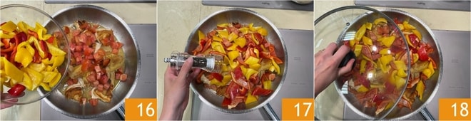 Ajoutez également les poivrons 16, le sel, le poivre 17 et couvrez avec un couvercle 18.
