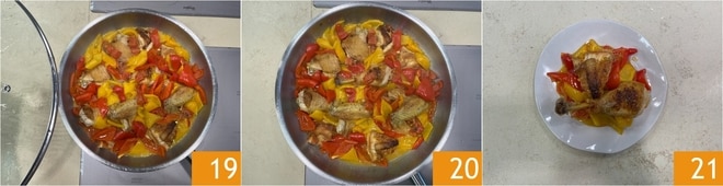 Laissez cuire pendant 40 minutes, puis retirez le couvercle 19. Montez le feu pour éventuellement réduire le jus 20 et servez 21.