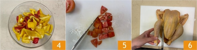 Rassemblez les poivrons jaunes et rouges dans un bol 4. Coupez également les tomates en dés 5. Maintenant, occupez-vous du poulet, vous devrez le couper en morceaux ; si vous n'avez pas beaucoup de dextérité, nous vous conseillons de l'acheter déjà coupé. En utilisant un couteau bien aiguisé, séparez d'abord les cuisses 6.
