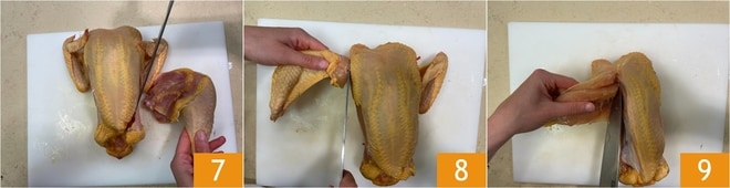 De celles-ci, découpez les pilons et les hauts de cuisse 7. Séparez maintenant également les ailes 8 et les blancs 9.