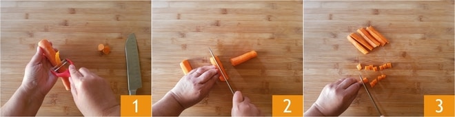 Pour préparer le poulet chasseur en blanc, commencez par éplucher la carotte 1, taillez-la et découpez-la d'abord en rondelles 2, puis en dés d'environ 1 cm 3.