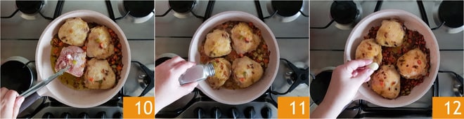 Laissez-les rissoler et lorsqu'ils seront bien dorés, retournez-les 10. Salez et poivrez 11, puis ajoutez la gousse d'ail 12