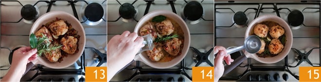 et les herbes aromatiques fraîches 13. Déglacez avec le vin 14 et laissez s'évaporer quelques secondes. Ajoutez une louche d'eau chaude 15,