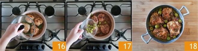 couvrez avec un couvercle et laissez cuire environ 20 minutes, en ajoutant si nécessaire un peu d'eau chaude. Une fois le temps écoulé, retirez l'ail et les herbes aromatiques, puis ajoutez les olives vertes dénoyautées 17 et laissez sur le feu encore environ cinq minutes. En fin de cuisson, retirez du feu et laissez reposer le poulet chasseur en blanc quelques minutes avant de le servir 18.