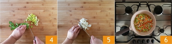 Lavez la branche de céleri et coupez-la en dés de la même taille que les carottes 4. Épluchez l'oignon, puis émincez-le et hachez-le grossièrement 5. Versez l'huile dans une grande casserole, laissez chauffer et ajoutez les légumes hachés 6.