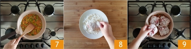 Laissez rissoler pendant quelques minutes à feu moyen en remuant souvent 7. Farinez légèrement les cuisses de poulet, en les secouant pour enlever l'excès de farine 8, et lorsque les légumes seront bien dorés, ajoutez le poulet dans la casserole, côté peau vers le bas 9.