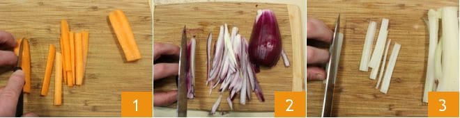 Pour réaliser le poulet en carpione, commencez par éplucher la carotte, puis coupez-la en fines lanières dans le sens de la longueur 1. Prenez l'oignon, épluchez-le et divisez-le en deux, puis placez la partie plate d'une moitié sur une planche à découper et tranchez-la dans le sens de la longueur 2. Lavez bien la branche sous l'eau courante et retirez les feuilles extérieures, celles sur les côtés et sur le dessus. Retirez la membrane filamenteuse extérieure avec l'éplucheur. Divisez la branche en deux et coupez-la en plusieurs fines lanières 3.